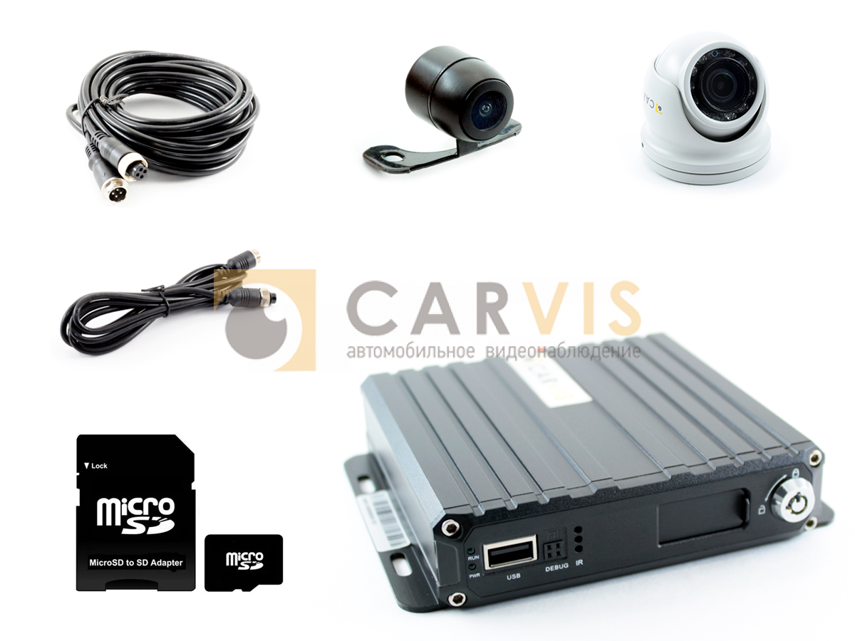 Комплектация Одна камера видеонаблюдения CARVIS MC-301, кабель для подключения камер, одна камера CARVIS MC-324IR, видеорегистратор CARVIS MD-444SD Lite, SD карта на 128 Гб.